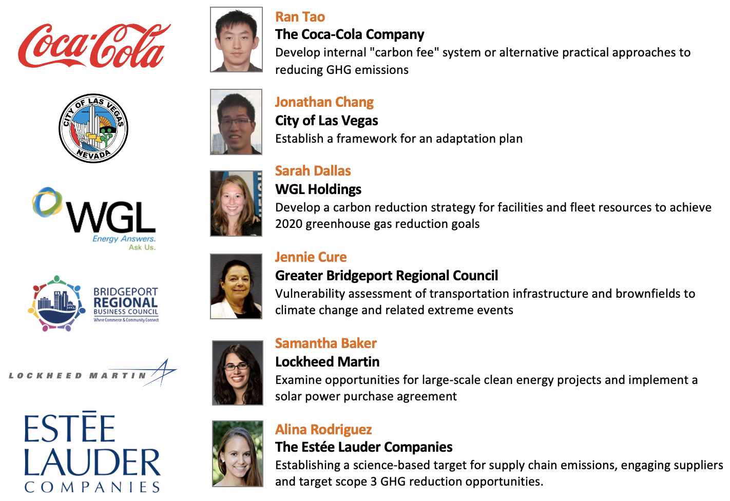 The fellowship program is designed to deliver compelling business cases for climate change programs focused upon energy and GHG management, supply chain management, adaptation and resilience, incorporating climate science into operational decision making, risk management, etc. The fellows work with employers to develop new climate action programs and thought processes, as well as bring new ideas that will increase support for their related initiatives.
